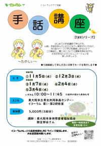 はじめての手話講座で学んだ方、以前、手話を学んでいたけどもう一度学びたい方など、月1回のペースで学びを継続しませんか? この機会に、聞こえについての理解を深めながら、さまざまな人とのコミュニケーションを楽しみましょう。 |