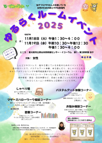 生きづらさやストレスを感じている女性のための安心できる居場所 「ゆるらくルーム イベント2025」を開催します。 しんどさやストレス・悩みを感じている女性のためのイベントです。 パステルアート体験、マザーズハローワーク相談コーナー(18日のみ)、お悩み相談コーナー、図書コーナー、しゃべり場など・・ リラックスコーナーでゆったり過ごすだけでもOKです! 途中参加・退出・自主休憩など、自由にお過ごしいただけるお部屋 〈ゆるらくルーム〉の特別な2日間のイベントです。 ※ゆるらく・・・生きづらさや不安・ストレスを感じている女性たちが、こころをゆるめる、からだをゆるめる、思考をゆるめる、楽に生きる、楽しく生きる、をめざしています |