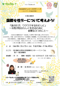 国際女性デーについて考えよう!「選ぶたび、ワクワクするわたしに」~女性が自分らしく生きるために必要な3つのこと~ 3月8日の国際女性デーを記念して世界中で様々な催しが行われます。 エンパワーメントの大切さ、性別にかかわらず、一人ひとりが尊重される社会に向かい、 いきいきと暮らすために、必要なことについて学びましょう。 講 師:東大阪市立男女共同参画センター副統括責任者 金 香百合(きむ かゆり)さん |