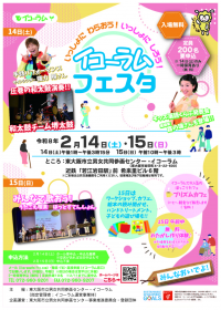 皆さまのお越しをお待ちしております。 --2月14日(土)--- ホールイベント ・キッズ落語くらぶ発表会 ・和太鼓演奏 ・手話パフォーマンス ・登録団体活動紹介 ---2月15日(日)--- ホールイベント ・うたごえ喫茶‘ほっとすてんしょん’ 研修室・ギャラリー・ホワイエなど ・登録団体ワークショップ ♪両日ともプリズムカフェ営業♪ ぜひ遊びに来てください!! 14日(土) 【ホールイベント】午後1時~3時15分(開場 午後0時30分) ・東大阪市長 あいさつ ・キッズ落語くらぶ発表会(落語家 露の瑞さんとキッズ落語くらぶのお子さんによる発表) ・和太鼓演奏(和太鼓チーム 堺太鼓) ・手話パフォーマンス(サインシンガー 強力翔さん) ・登録団体活動紹介 ※2月14日(土)ホールイベントのみ申込が必要です。 15日(日) 【ホールイベント】午前10時15分~11時30分(開場 午前10時)(申込不要) 「懐かしの歌をうたおう!」 うたごえ喫茶‘ほっとすてんしょん’ 心に残るあの頃歌った名曲の数々をみんなで歌おう! 【研修室等ワークショップ】 ≪登録団体によるワークショップ≫ 両日とも、プリズムカフェで軽食と飲み物を販売します。 【同時開催・ギャラリー展示】 2月7日(土)~2月21日(土) 登録団体の活動紹介 イコーラムフェスタは、多くの市民の方にイコーラムに来ていただき、イコーラム及び登録団体の日ごろの活動や取り組みを知っていただくことで、男女共同参画についての理解をさらに深めていただこうと企画した催しです。 |