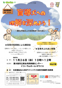 ✨講演会「盲導犬への理解を深めよう!~誰もが自立した生活をおくるために~」 盲導犬指導員からユーザーの体験談、盲導犬の役割解説を聞き、あらゆる人が取り残されない社会に向けて私たちができることは何かを考えませんか。 ✨ふれあいコーナー~盲導犬とのふれあいから学ぼう! この機会に盲導犬の役割を理解し、その重要性と支援方法などを盲導犬指導員から聞いてみよう!希望の方は記念撮影もいたします。 とき:令和7年11月26日(水)午前10時~午前12時 ところ:東大阪市立男女共同参画センター・イコーラムホール ホワイエ 申込方法:事前申込不要 参加費:無料 定 員:50人 講師:社会福祉法人日本ライトハウス盲導犬訓練所 指導員・盲導犬のPR犬(盲導犬普及の広報活動をしている犬) |